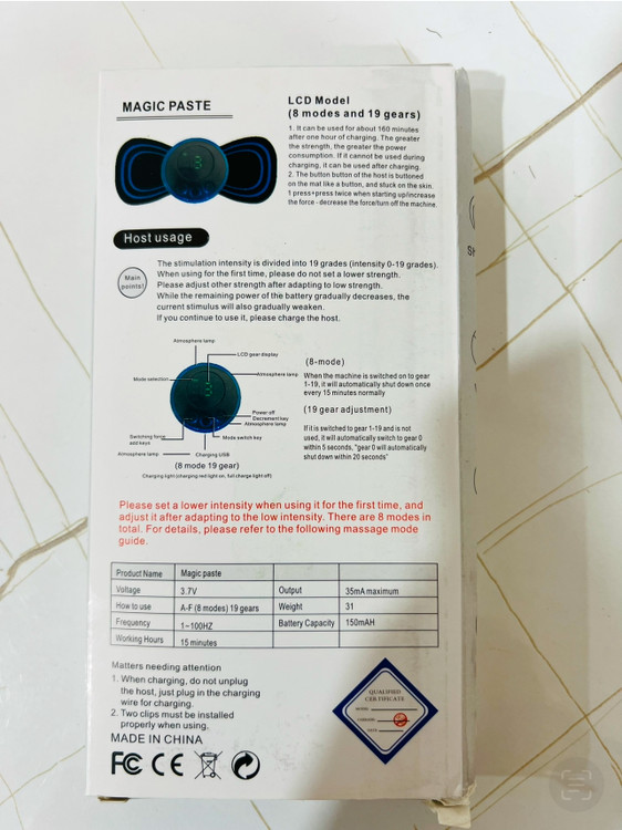 محصول برای افرادی که بیماری های قبلی دارند مناسب نیست >توجه قبل استفاده حتما فیلم اموزش استفاده از محصول را در گوگل سرچ کنید چون در صورت نااشنا بودن با نحوه کار احتمال خرابی محصول بالاست ماساژور برقی پروانه ای با ایجاد جریان ضعیف الکتریکی ماهیچه های اعضای مختلف بدن را تحت تاثیر قرار میدهد. این دستگاه با موج الکتریکی باعث از بین بردن هرنوع انقباض یا گرفتگی و یا خستگی عضلانی میشود. دارای 8 حالت مختلف و 19 درجه قدرت میباشد. از این مینی پچ ماساژ می توان برای ماساژ قسمت های مختلف کل بدن مانند گردن، پشت، کمر، باسن، پاها، بازوها و غیره استفاده کرد. دارای باطری و کابل USB با قابلیت شارژ توسط پاوربانک، شارژر، لپتاپ و … میباشد.یک هدیه بی نظیر و کاربردی برای تمامی افرادی که دوستشان دارید. ماساژور برقی پروانه ای محصولی بی نظیر با کارایی شگفت انگیز برای ماساژهای عمیق و کامل TENS مناسب است. هر گونه تورم را کاهش می دهد، گردش خون را افزایش می دهد و هر گونه درد ماهیچه ای را از بین می برد و پس از یک ماساژ کامل حس خوبی را به شما منتقل می کند.فقط 15 دقیقه در روز ممکن است به حفظ گردش خون سالم پاها، تسکین سریع درد پا و کاهش خستگی آن کمک کند. نیاز به گذاشتن زمان زیاد نیست و می توانید از این ماساژور صفحه ای پا در هنگام مطالعه، تماشای تلویزیون یا لذت بردن از یک فنجان چای، راحت بنشینید، استراحت کنید و اجازه دهید ماساژور پا به کارش برسد و لذت ببرید.هر جلسه ماساژ EMS شما 15 دقیقه طول می کشد و می توان آن را از راحتی در خانه انجام داد. ماساژور برقی پروانه ای اندازه کوچک و وزن سبکی دارد. و برای بسیاری از موارد مانند استراحت ناهار، مسافرت، سفر کاری، سرگرمی، کارهای خانه و غیره مناسب است. زنان باردار و افراد با مشکلات قلبی و فشار خون استفاده نکنند.