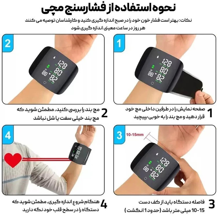 - مچبند را روی مچ خود ببندید (13.5–19.5cm مناسب).