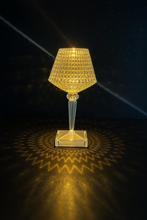 این آباژور با بدنهای شفاف و کریستالی طراحی شده است که نور را بهصورت الماسگونه پخش میکند. الگوهای هندسی روی سطح آن، هنگام روشن شدن، سایههایی زیبا و درخشان روی سطح اطراف ایجاد میکنند که حس و حال فضا را کاملاً دگرگون میکند. پایه مربعی و کریستالی این آباژور نیز به استحکام و زیبایی آن افزوده است.