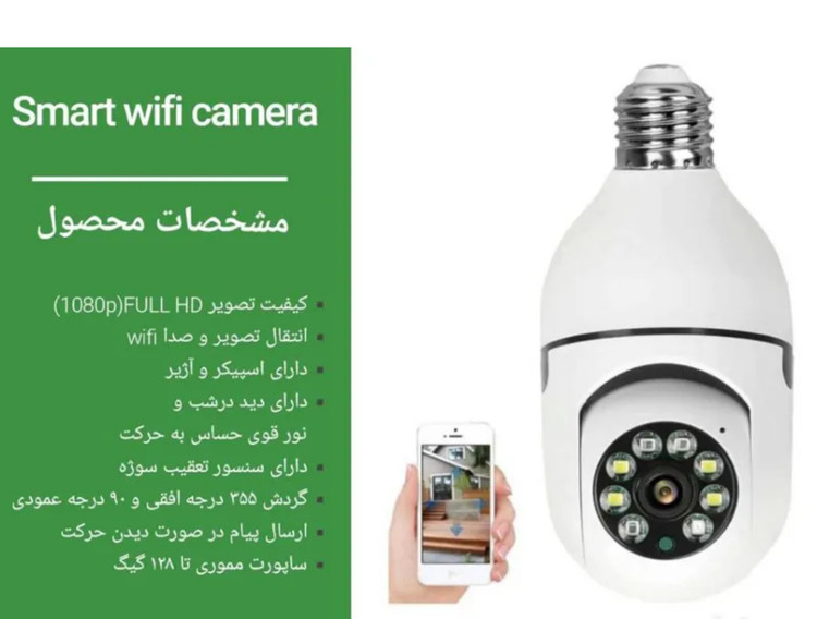 دوربین وای‌فای پانوراما سقفی با دید ۳۶۰ درجه و ذخیره‌سازی ابری | نصب آسان در سرپیچ لامپ