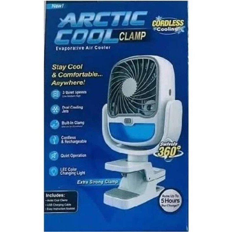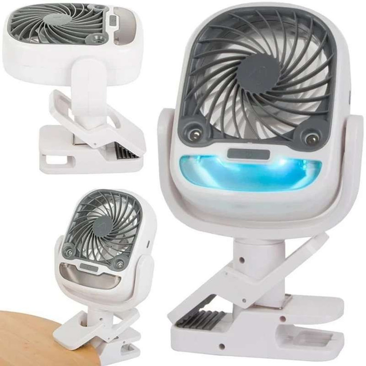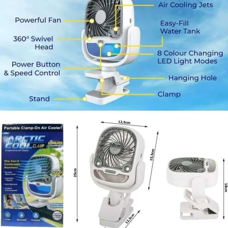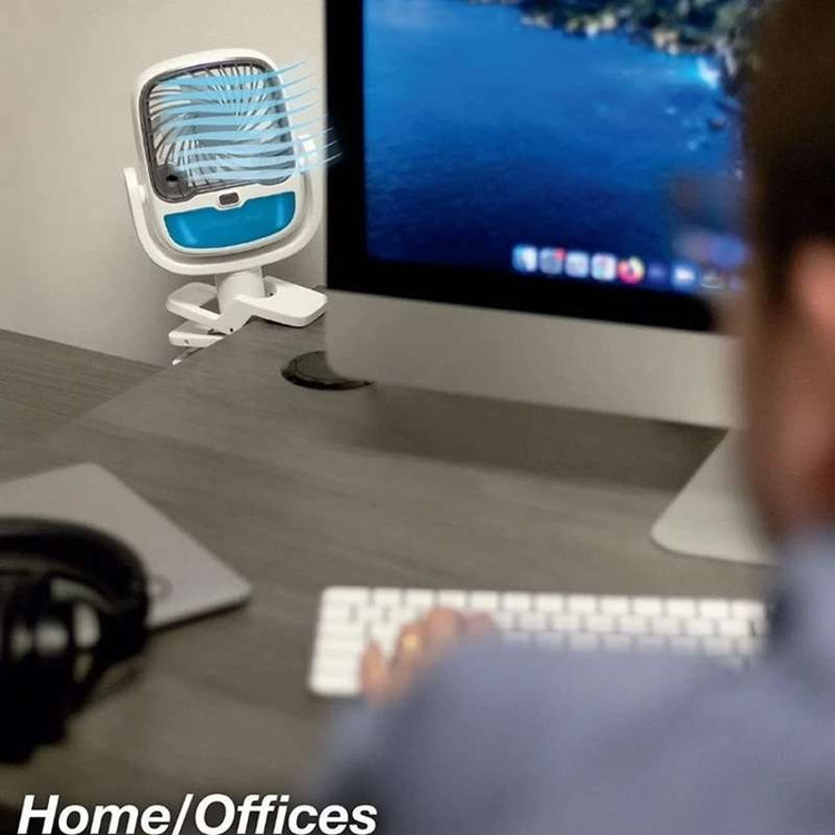 یک پنکه با گیره که بتوانید آن را آویزان کنید یا به طور طبیعی بنشینید و به شما امکان می دهد در هر زمانی از روز از هوای تازه و تمیز لذت ببرید. همچنین مجهز به مخزن آب با دو نازل برای مه پاش است. با شارژ از طریق اتصال USB کار می کند و دارای سه سرعت مختلف است.